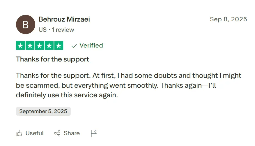 Behrouz from the US was initially skeptical, writing in September 2025: “At first, I had some doubts and thought I might be scammed, but everything went smoothly. Thanks again—I’ll definitely use this service again.”