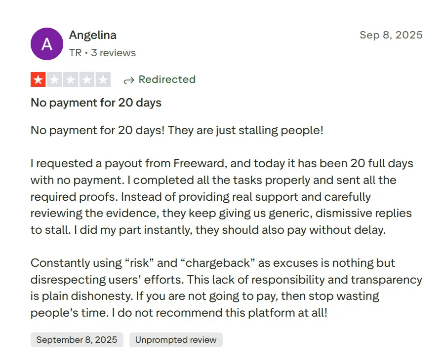 Angelina from Turkey waited 20 days for payment in September 2025, accusing Freeward of stalling and citing “risk” and “chargeback” excuses.