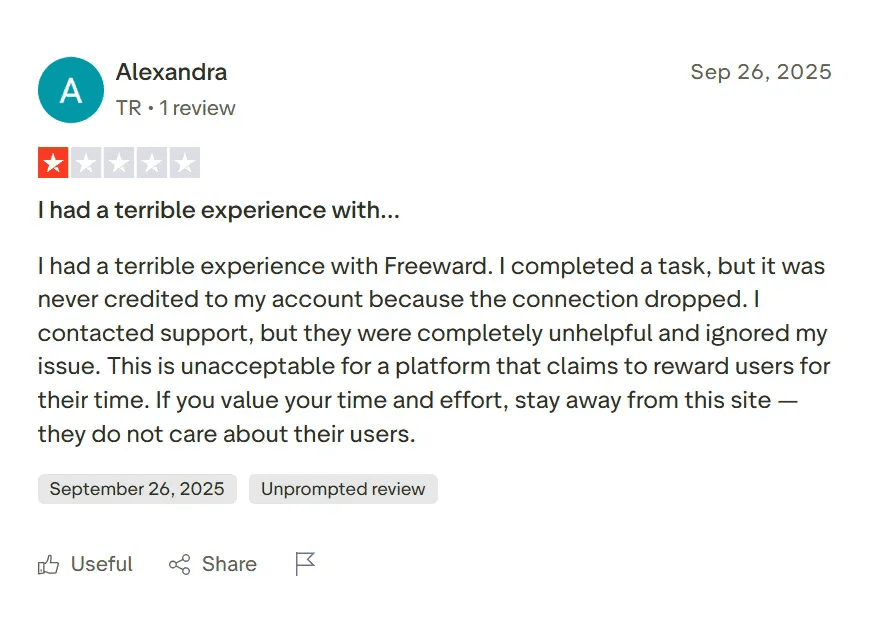 Alexandra from Turkey completed a task in September 2025, but her connection dropped and the offer never credited. Support couldn’t help.